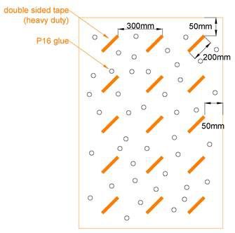 - Apply glue in a blob and round shape sized min 20mm and irregular order with space of no more than 150mm apart.